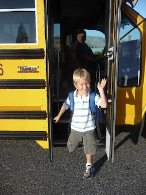 The first day, Tristan hopped right on the bus and sat in the seat right behind the driver. He swung his legs eagerly! The second day, Tristan went straight to the back of the bus. It didn't take him long to figure out where all of the "Cool kids" sit! :) I asked him what he did on his 45 minute bus ride. He said, "I looked out this window, and then I looked out this window, and then I looked out this window..." He loved it and insisted on waking up early enough to catch the bus.